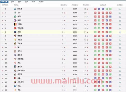 排名4-10位的分别是葡萄牙(1199分)、哥伦比亚(1183分)、乌拉圭(1126分)、瑞士(1123分)、意大利(1112分)、巴西(1104分)和比利时(1084分)。荷兰队被比利时挤出了前10,排名下滑至第11位。